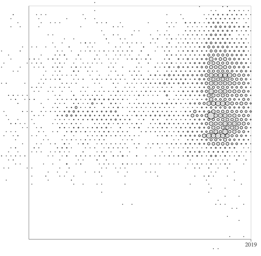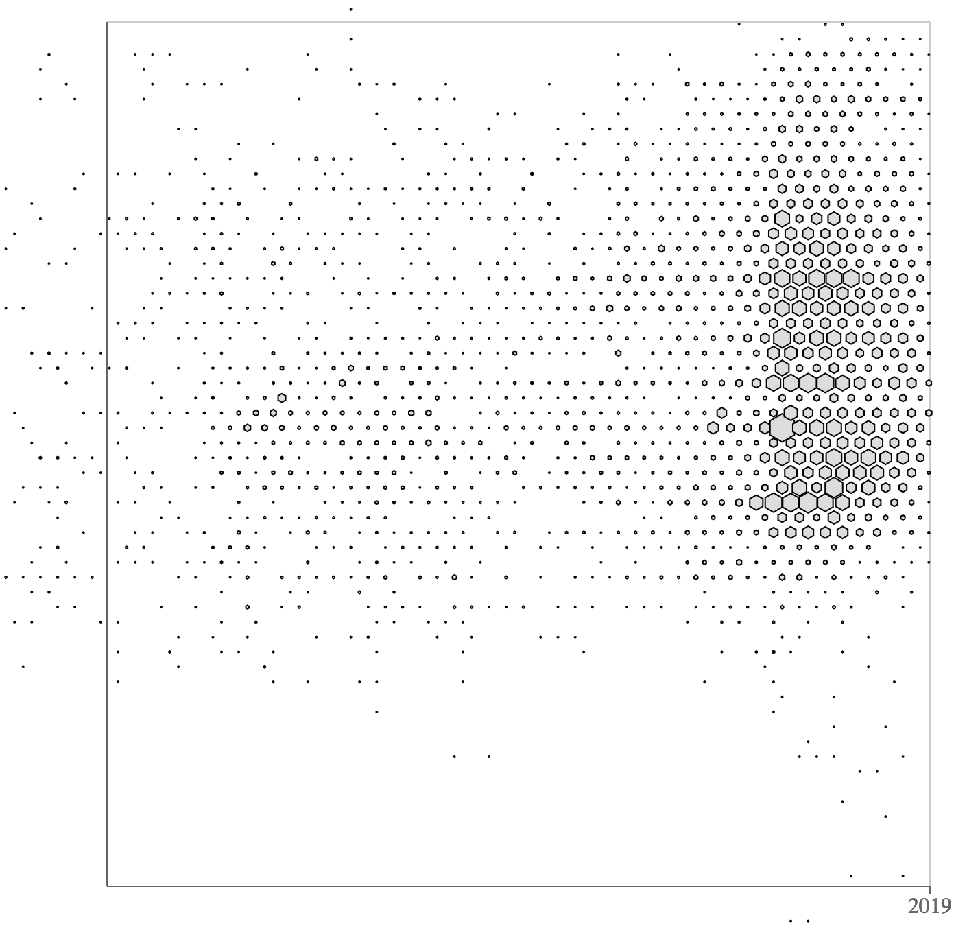 Unfortunately, I did not find any meaningful information revealed when attempting a couple visualizations using this data. First, I tried an x and y scatter plot. Because there were too many points, it slowed my computer to a halt. I ended up getting the average scale for each year and plotting that. Sadly I do not have this plot anymore as my code has changed, but basically there were no interesting patterns here. I then tried to use the d3-hexbin visualization tool to group points near each other into hexes. This didn’t produce anything that interesting: