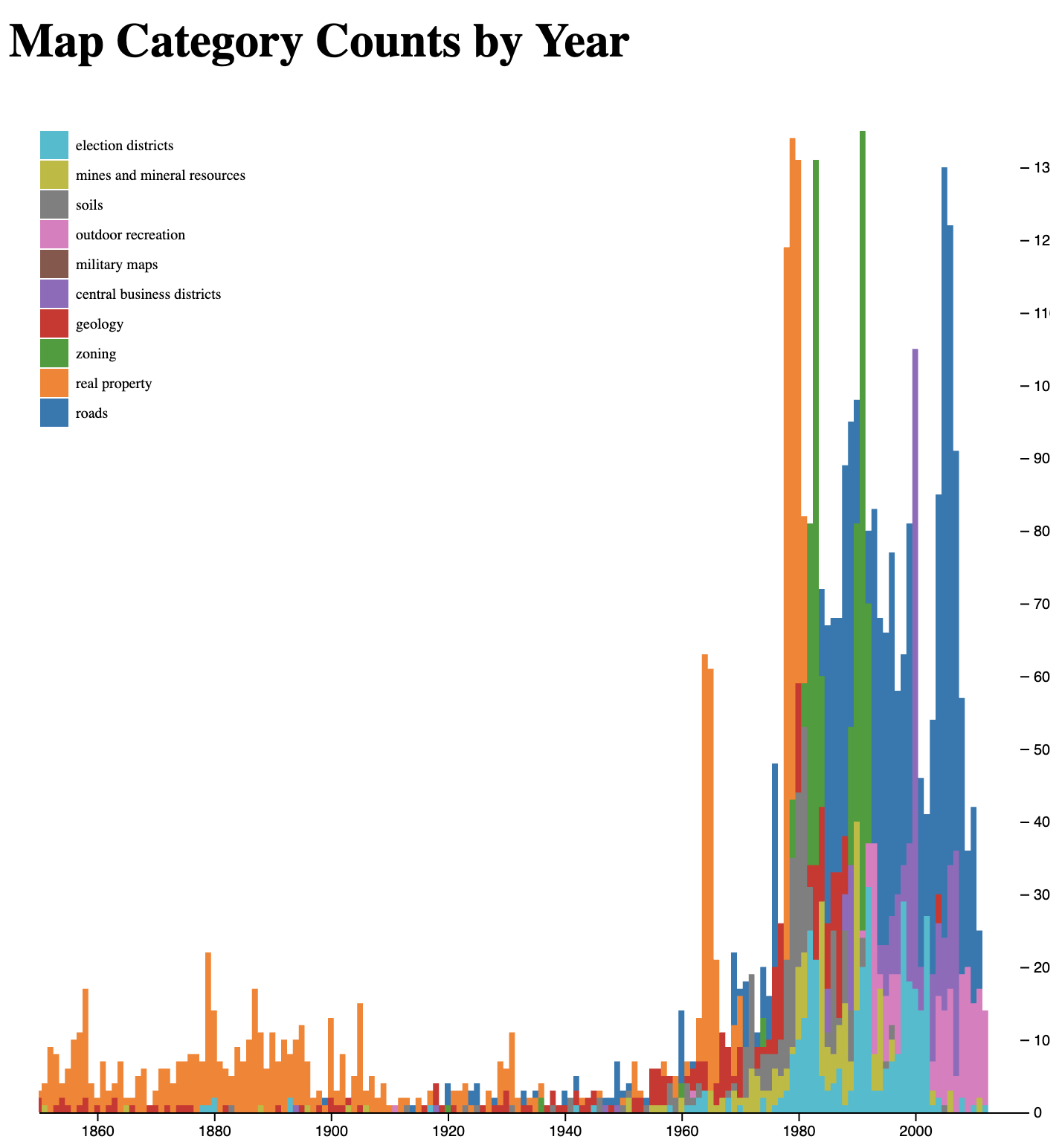 I wanted to come out with something meaningful, so the next thing I looked at was map categories over time. Maybe this would show what society was interested in?