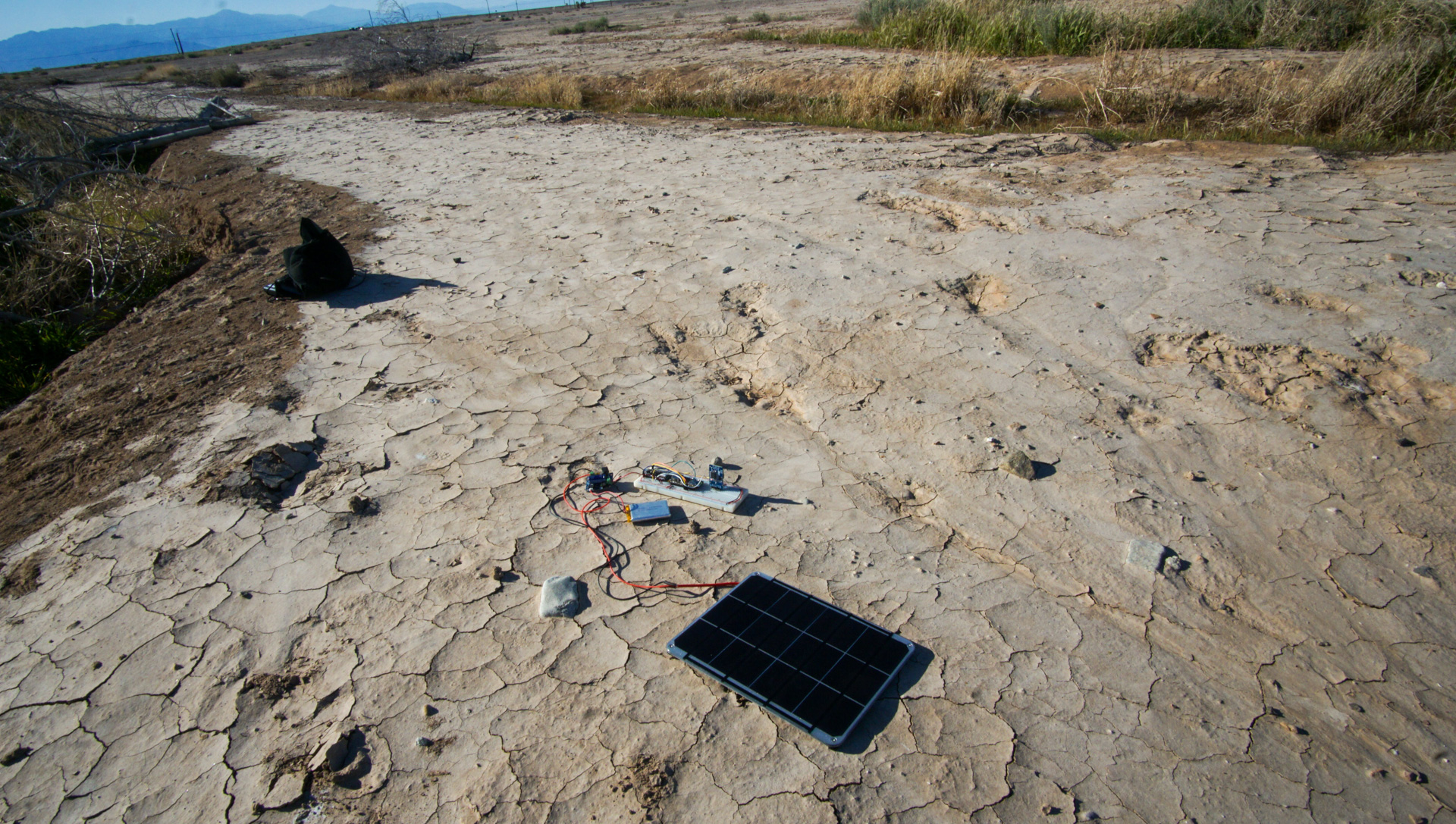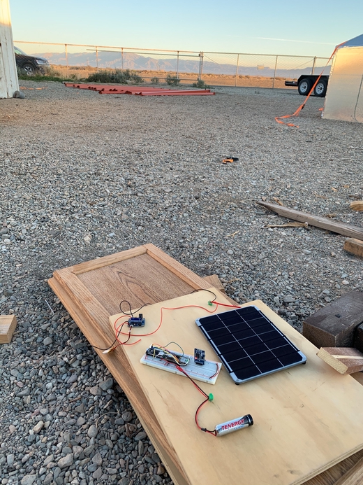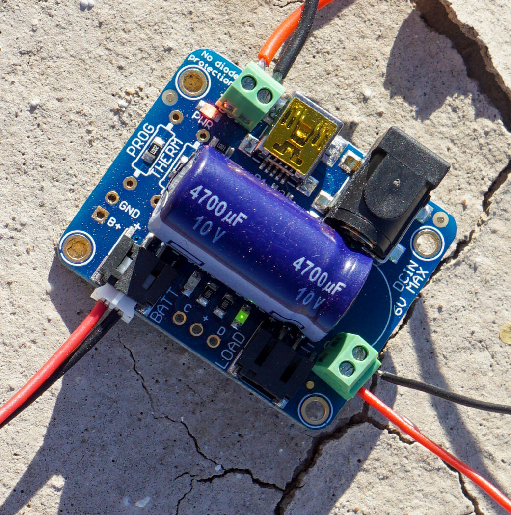 At Bombay Beach, I deployed the system connected to a 3.7v 2500 mah battery, 6w 5v solar panel, and Adafruit solar charger. With this setup, I was please to see that the system stayed on for a week, and often the battery was full as indicated by the green indicator on the solar charger.