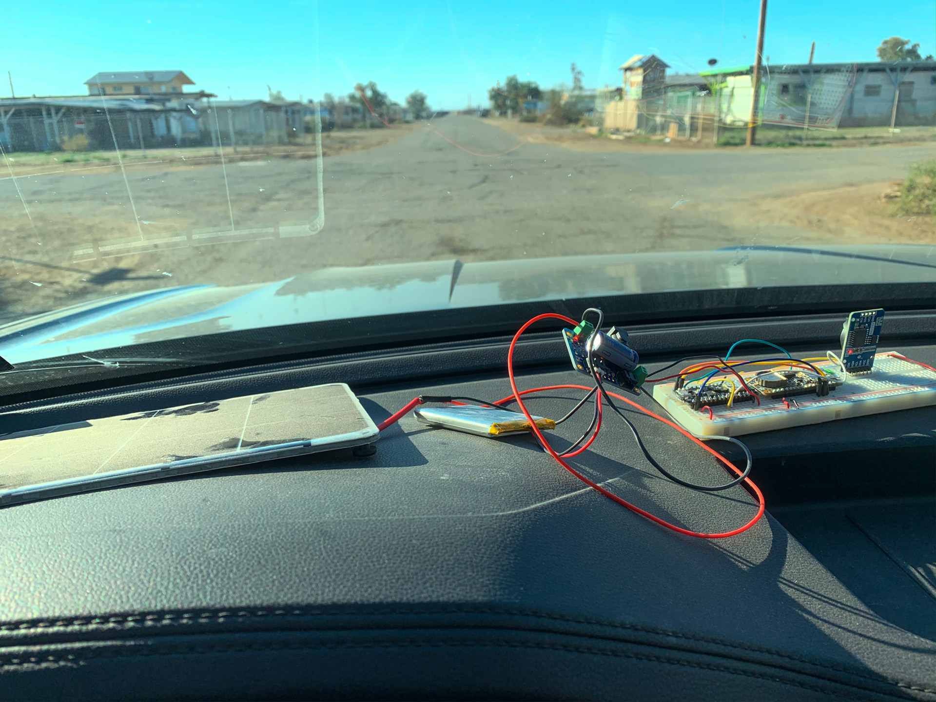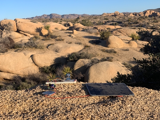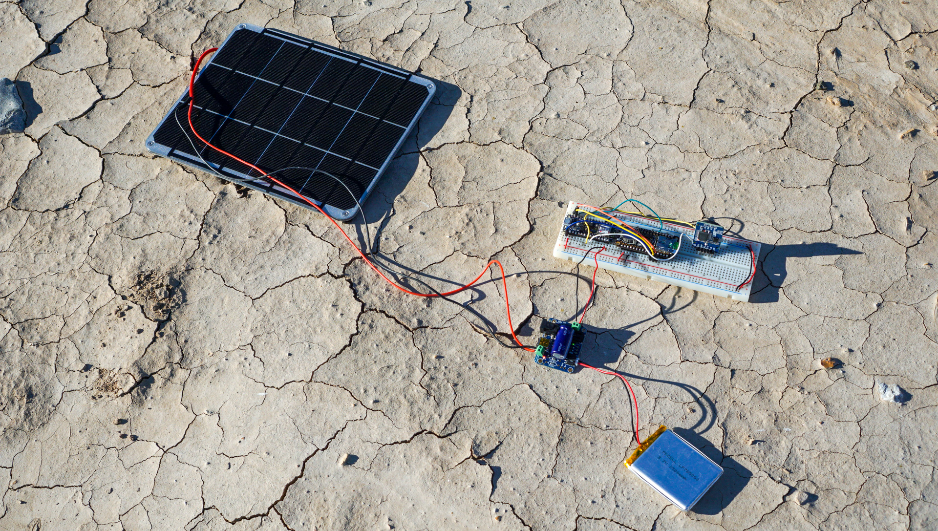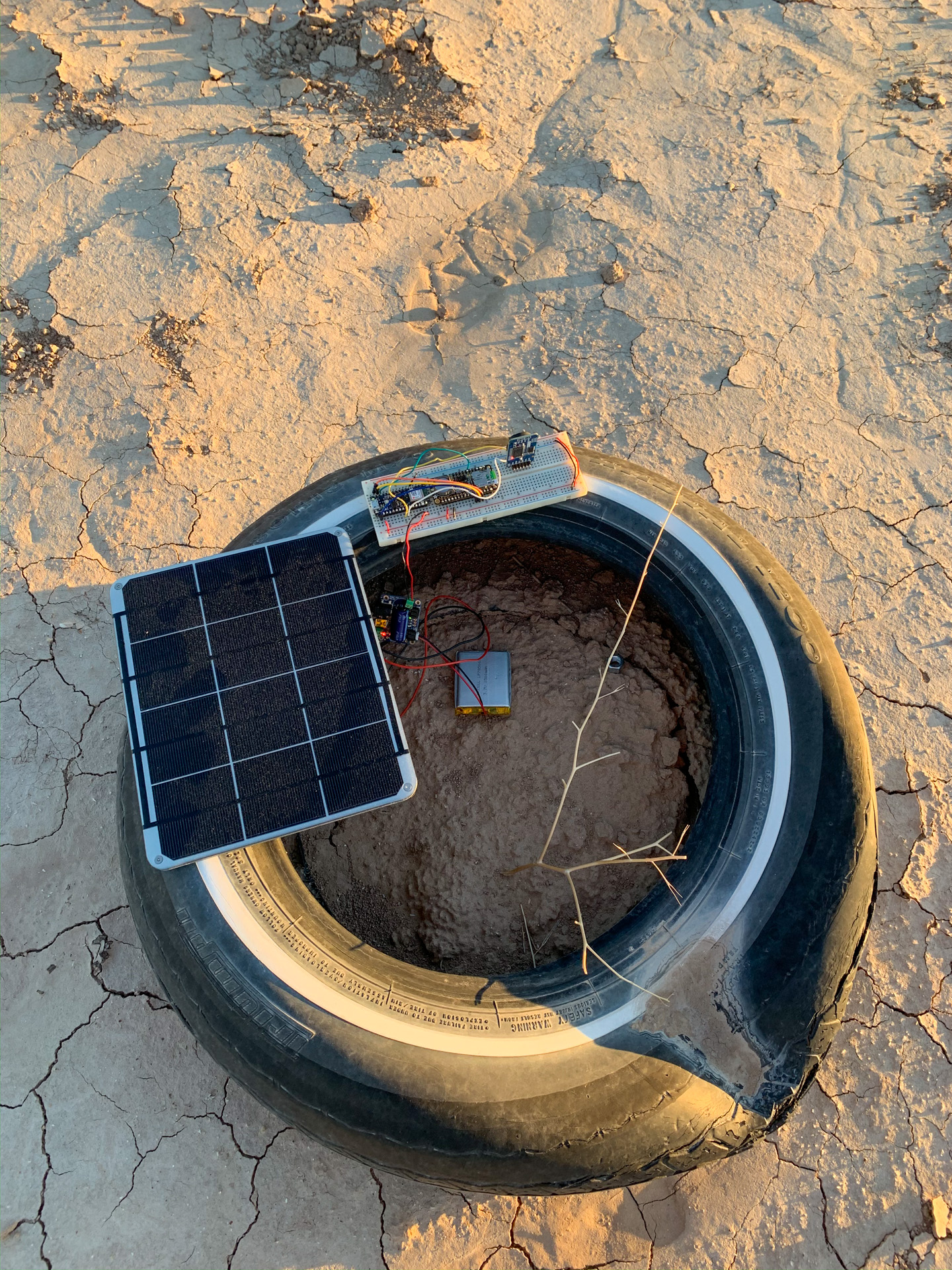 At Bombay Beach, I deployed the system connected to a 3.7v 2500 mah battery, 6w 5v solar panel, and Adafruit solar charger. With this setup, I was please to see that the system stayed on for a week, and often the battery was full as indicated by the green indicator on the solar charger.