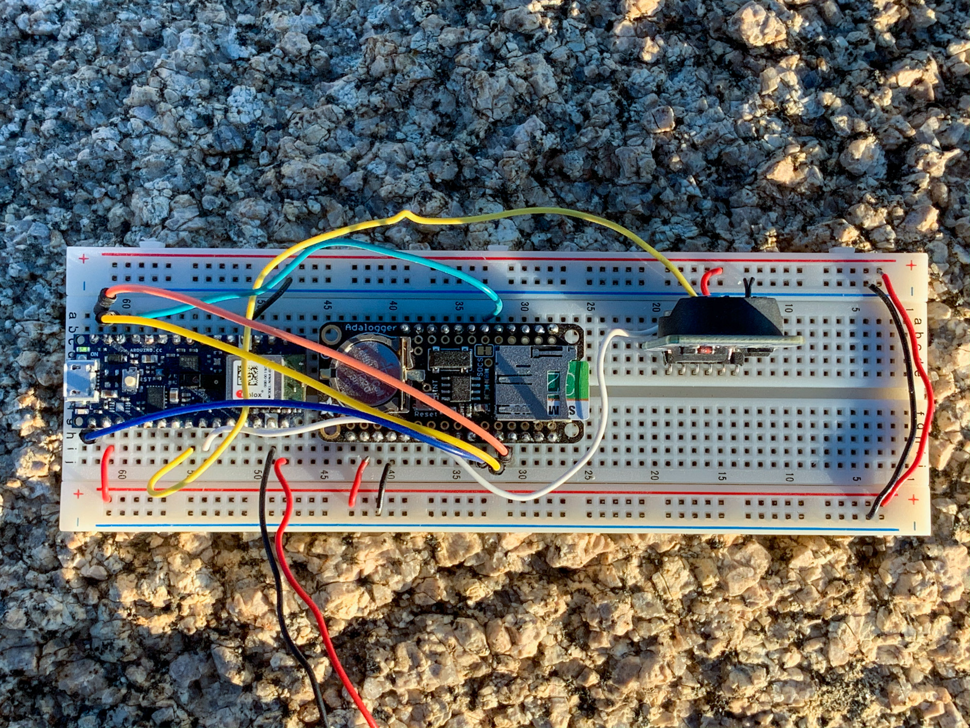 The Arduino is connected to a real time clock and an sd card. Using modified code from Blah’s WeatherStation #TODO Link and name, these sensors readings are gathered every 100ms. These readings are logged to an sd card, and timestamped using the time from the real time clock.