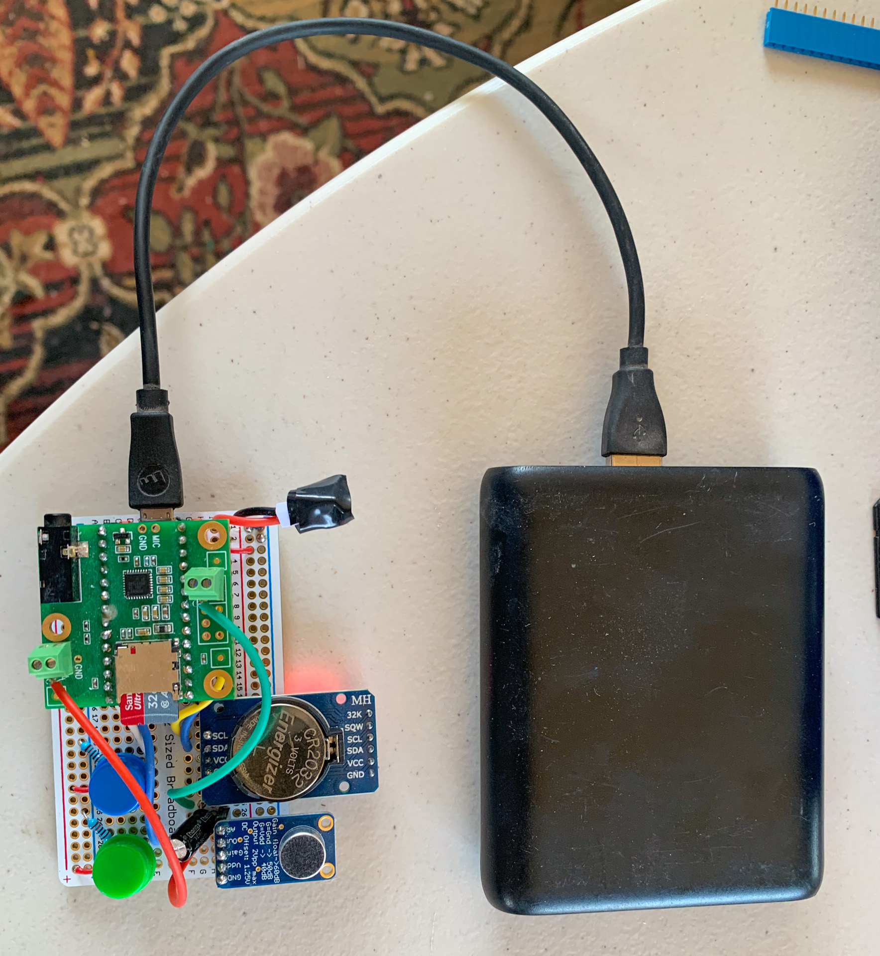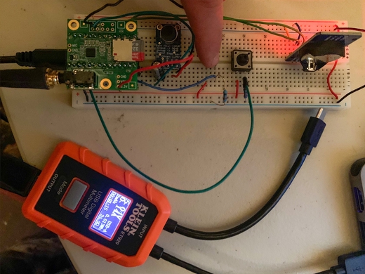 When connected to a standard battery pack, the circuit consumes 0.14 amps of energy. I was able to leave the device recording all night using a battery pack, and by the morning the pack still had most of its capacity left. Eventually I could have the whole system solar powereable, but didn’t get to doing this.