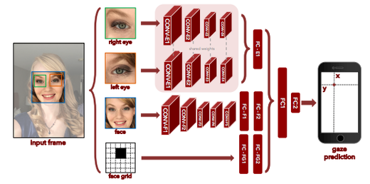 To do gaze estimation, the pre-trained convolutional network model Eye Tracking for Everyone is used. This model can estimate gaze position using just an image. It is device and screen invariant as it’s output is in centimeters.