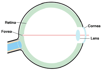 The fovea, located near the center of the retina, is densely covered with receptors, and provides much higher acuity vision than the surrounding areas. The fovea covers approximately one degree field of view, that is, a one-degree angle with its vertex at the eye, extending outward into space. Outside the fovea, acuity ranges from 15 to 50 percent of that of the fovea.