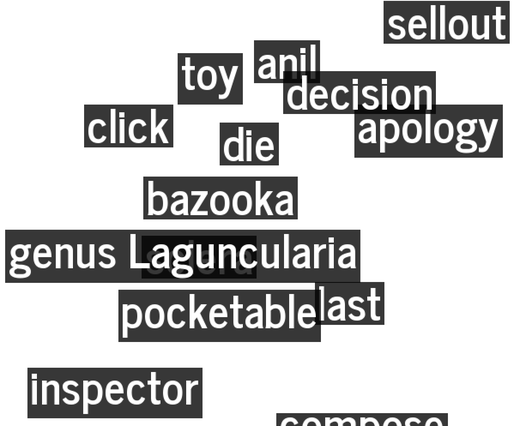 When a user focuses on a piece of text, another word is rendered away from area of focus. The system almost always chooses the word to be similar to the currently focused on word. To find similar words, Princeton’s Wordnet in json form is used to look up words that are in the same family along a graph. This allows different paths of words to be followed. Occasionally, a random word is chosen instead of one within the family, to avoid being infinitely stuck in a loop with words families that don’t branch out.