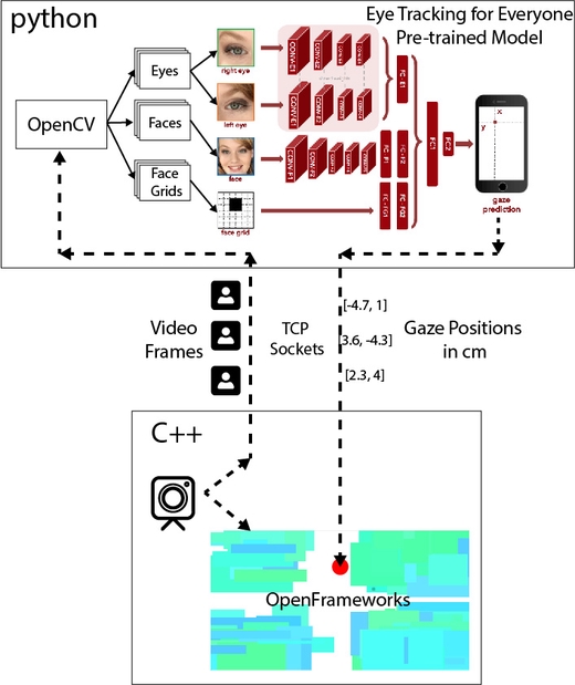 OpenFrameworks does the video capture, and streams it to a python application that extracts the features with opencv and feeds them through the Caffe model. The python application streams the estimated gaze positions back to the client.