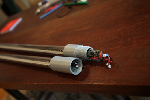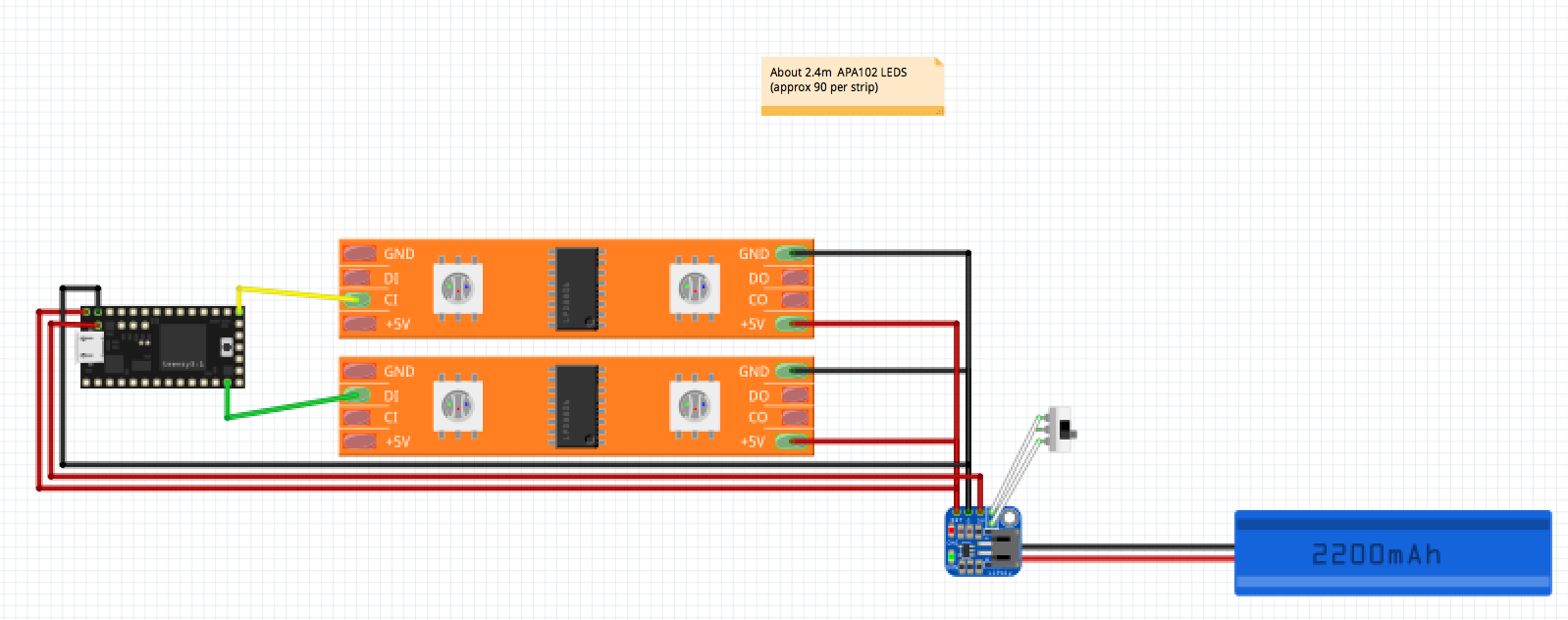 This circuit concisted of an Adafruit LiPoly Backpack Add-On connected to a Teensy 3.2. Two strips of APA102 Leds were soldered onto the Teensy. A 3.7V 2600mAh battery was soldered onto pads on the LiPoly Backpack charger.