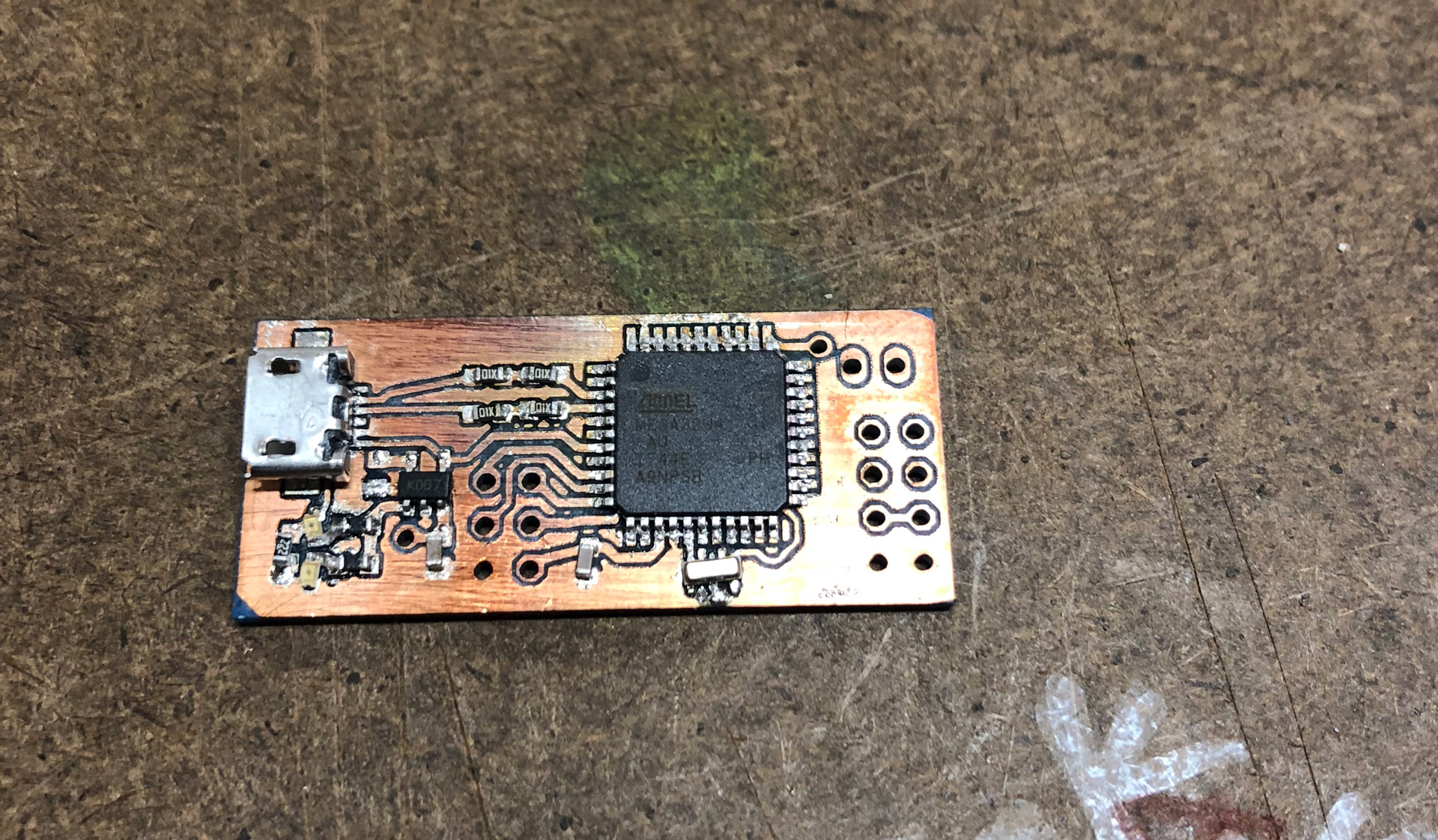 I used a pick and place to put the chips on the board. I manually put solder paste where the legs of the Arduino should be, and this was unreliable. It created too much solder but I thought maybe when reflow would happen it would bunch up only over the pads. I used reflow to melt the solder on the top, and then realized that this didn’t happen; the legs on the ATMega32u4 were shorted, so I stopped there: