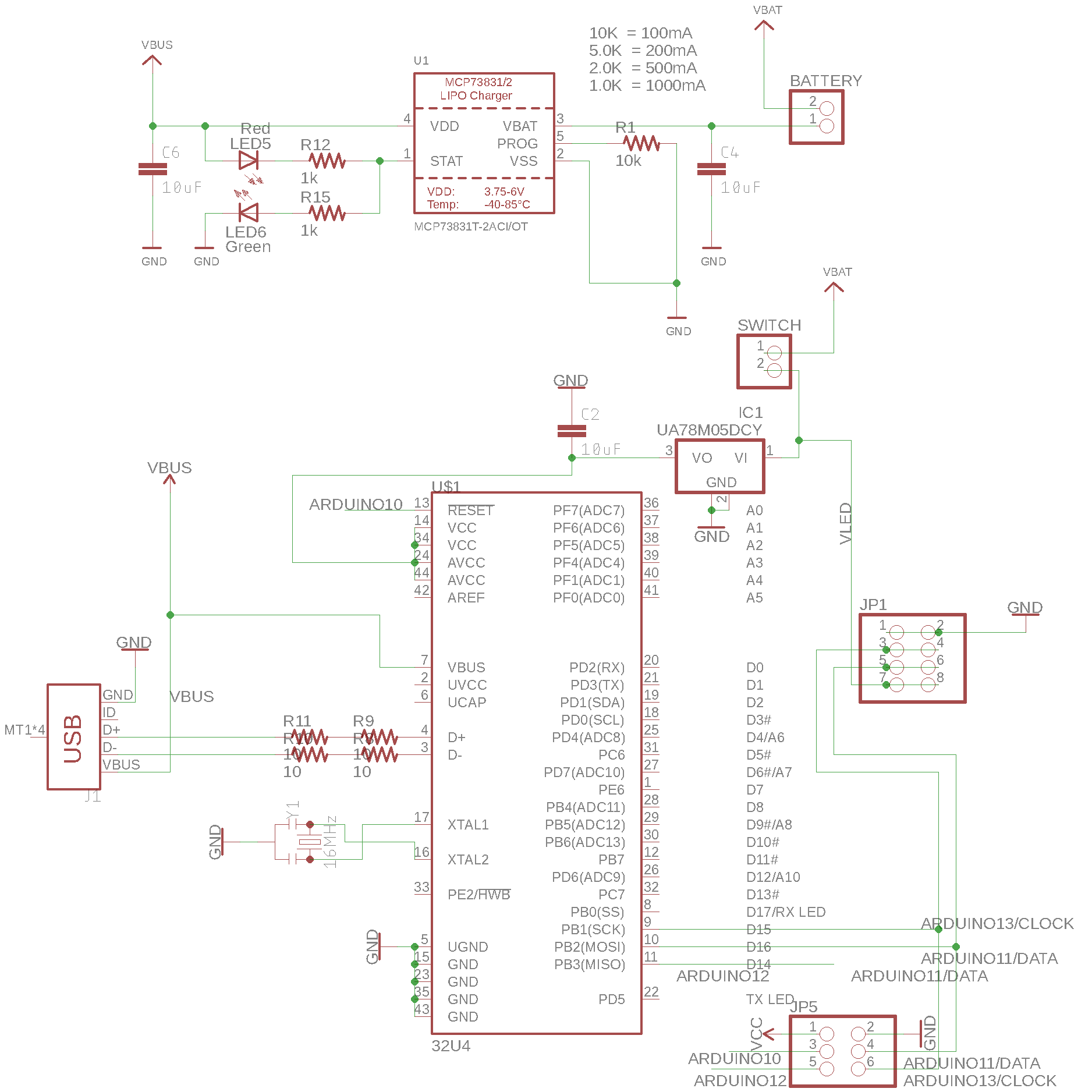 The usb port would be connected to the board. It would only power the board’s VBUS port, because it would only be used for usb programming. The usb power would also be routed to power the MPC73831T chip, the same one that exists on the Adafruit LiPo charger. Most of the design from the Adafruit board remained in this schematic, except a 10k resistor is used to drive 1A of charge to the Battery.