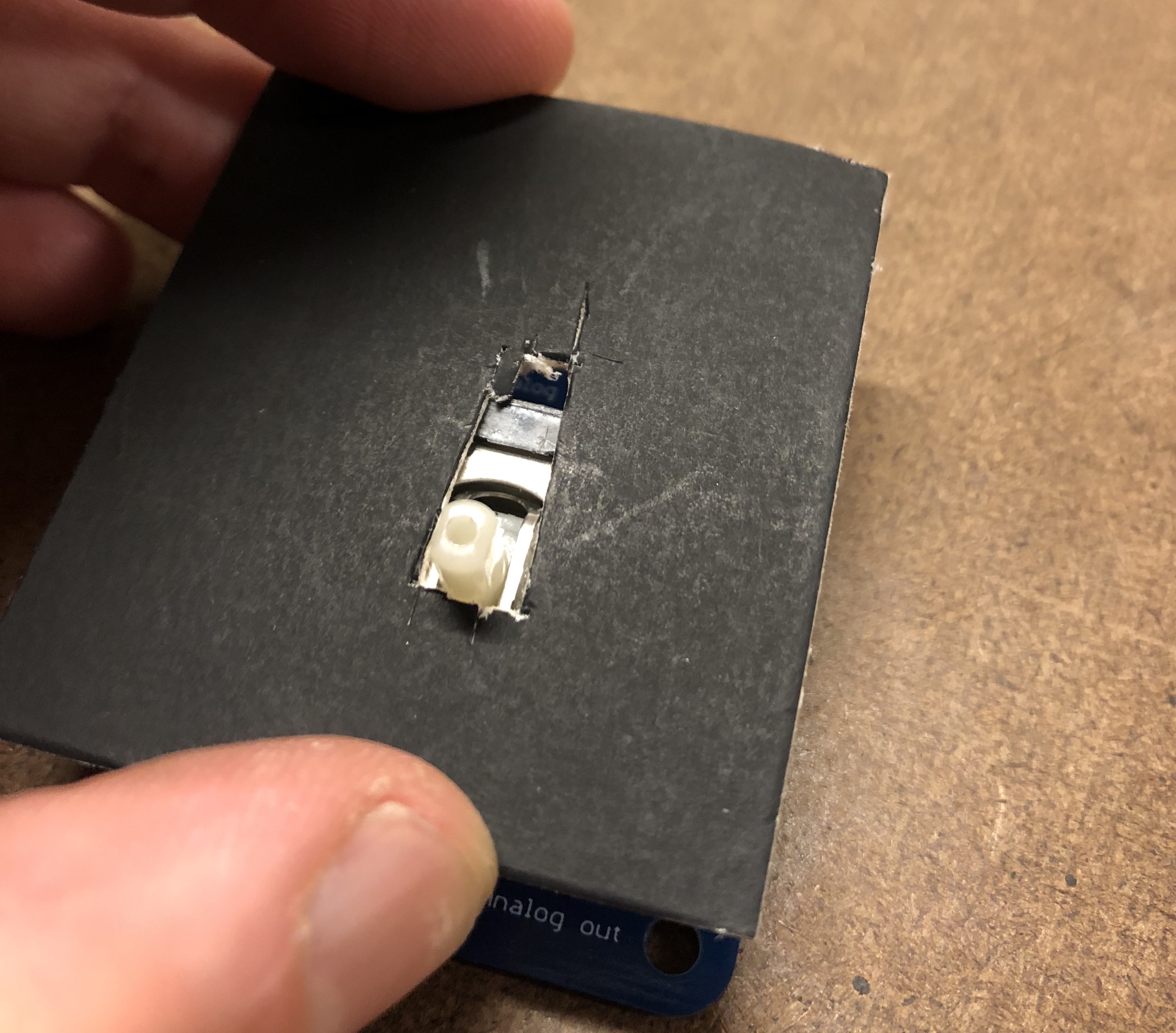 A clearer interface would be one where they can only pull the y in one direction and that would control the strenght of the thruster. To try making this, I cut a thin slot into a piece of card-paper, and removing the knob from on top of the joystick: